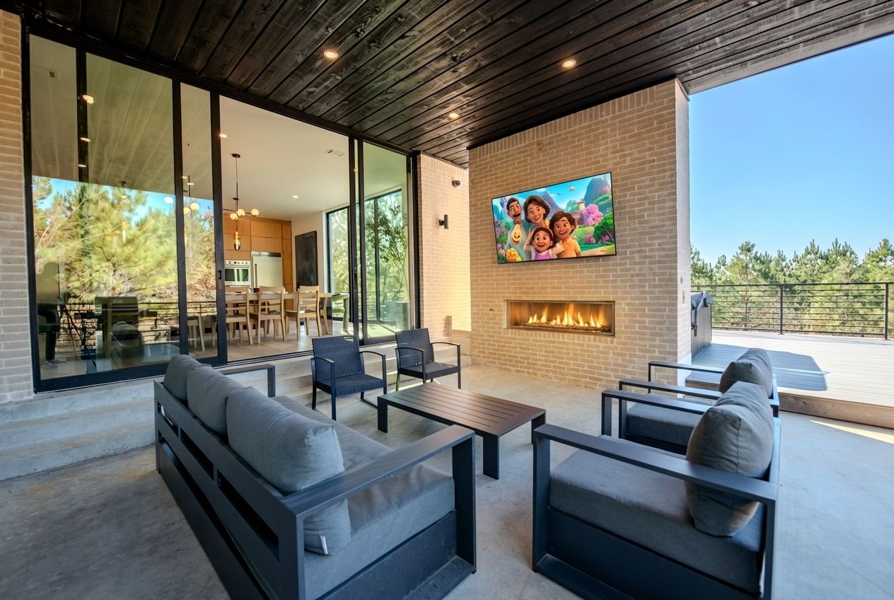 Fireplace glow wherever you are — living room or back deck.